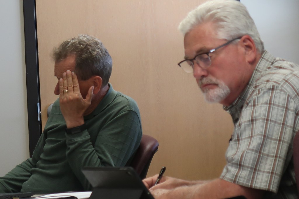 Fabian Knizacky, the former Mason County Administrator, talks over the meeting with MCC with Chairman Andrew Kmetz at the Land Bank meeting. Ludington Mayor Mark Barnett writes down a note.